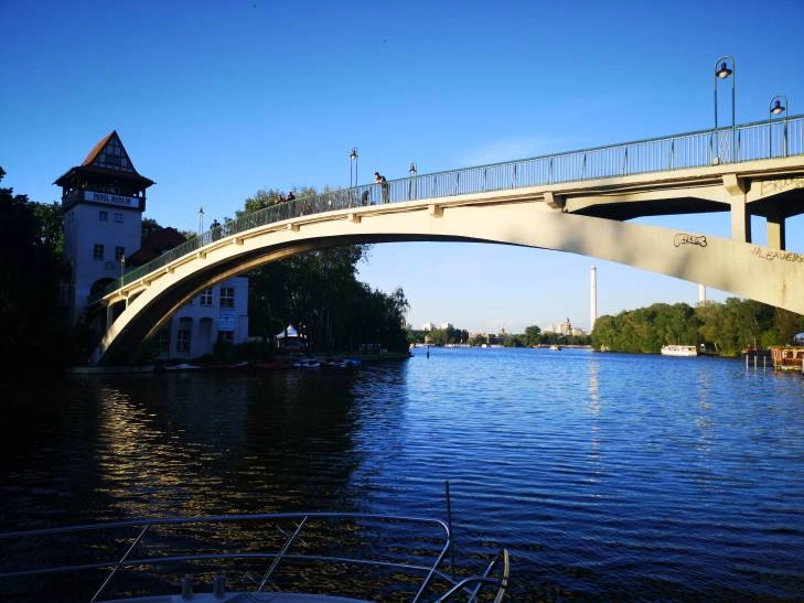 But our Walkative recommendation is another one - Abteibrücke zur Insel der Jugend (Abbey Bridge to the Island of Youth). Though perhaps not as famous as some other bridges in Berlin, this one and also the view from it is definitely one of the most romantic places in the centre of Berlin. Just 10 metres over the Spree River, the Abbey Bridge connects the famous Treptower Park with a tiny but cosy island. In order to get to the bridge and island you take an S-Bahn train that goes to "Treptower Park" station, then you walk about 10 minutes down a cute promenade along the Spree River, it's full of coffee-to-go, ice-cream and fast-food kiosks.
