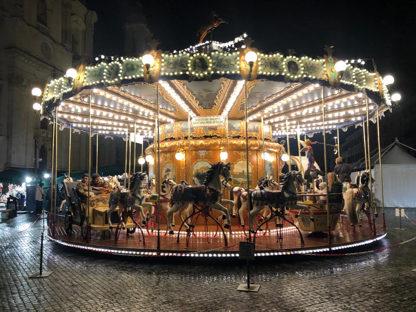 Iconic square transformed into a lively Christmas market and a winter wonderland of lights, carousels, and the irresistible aroma of Italian Christmas treats.